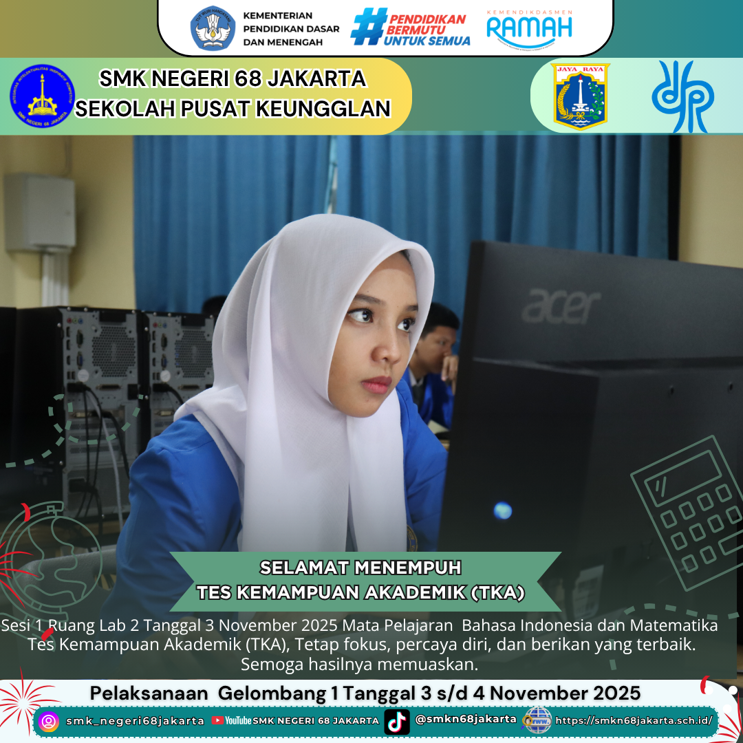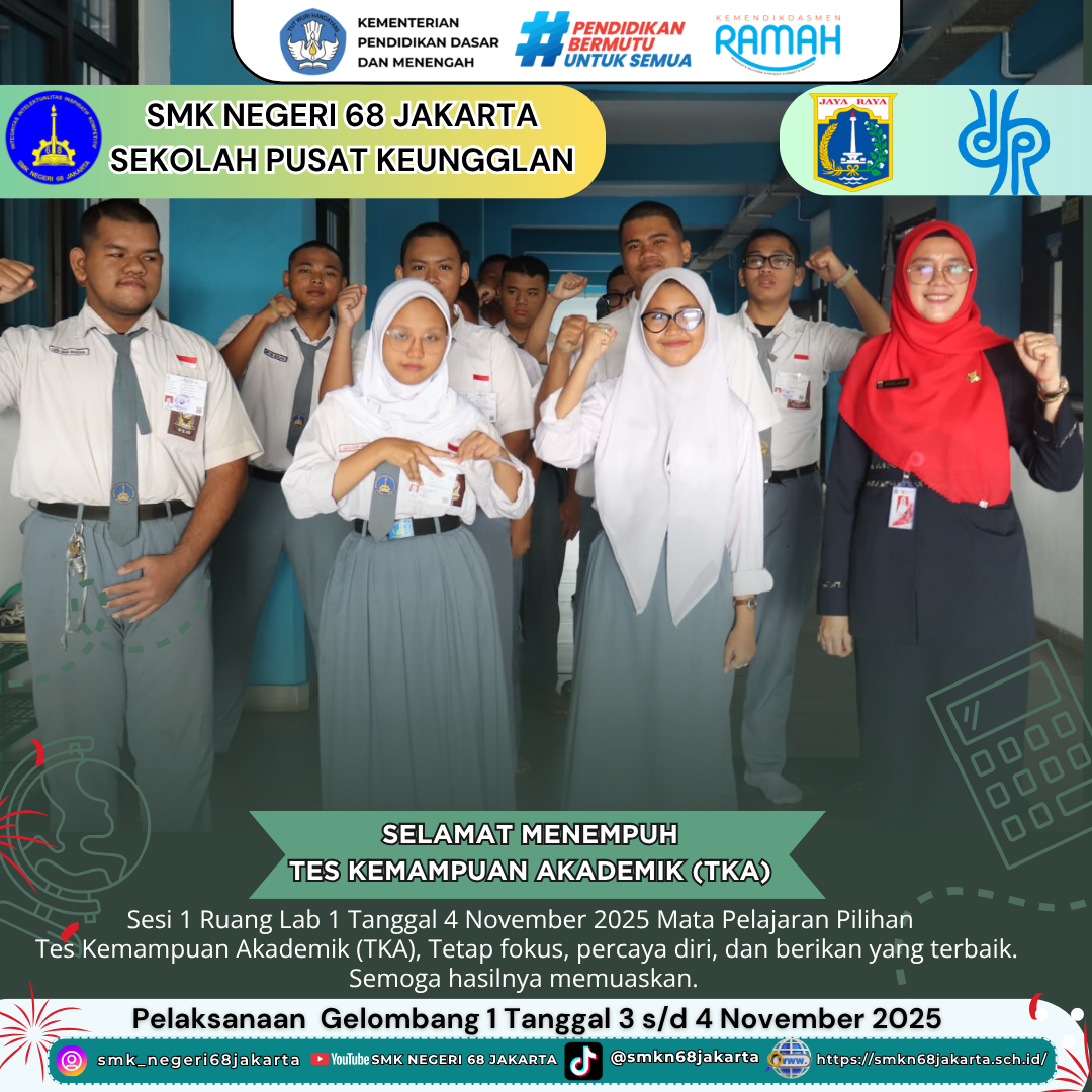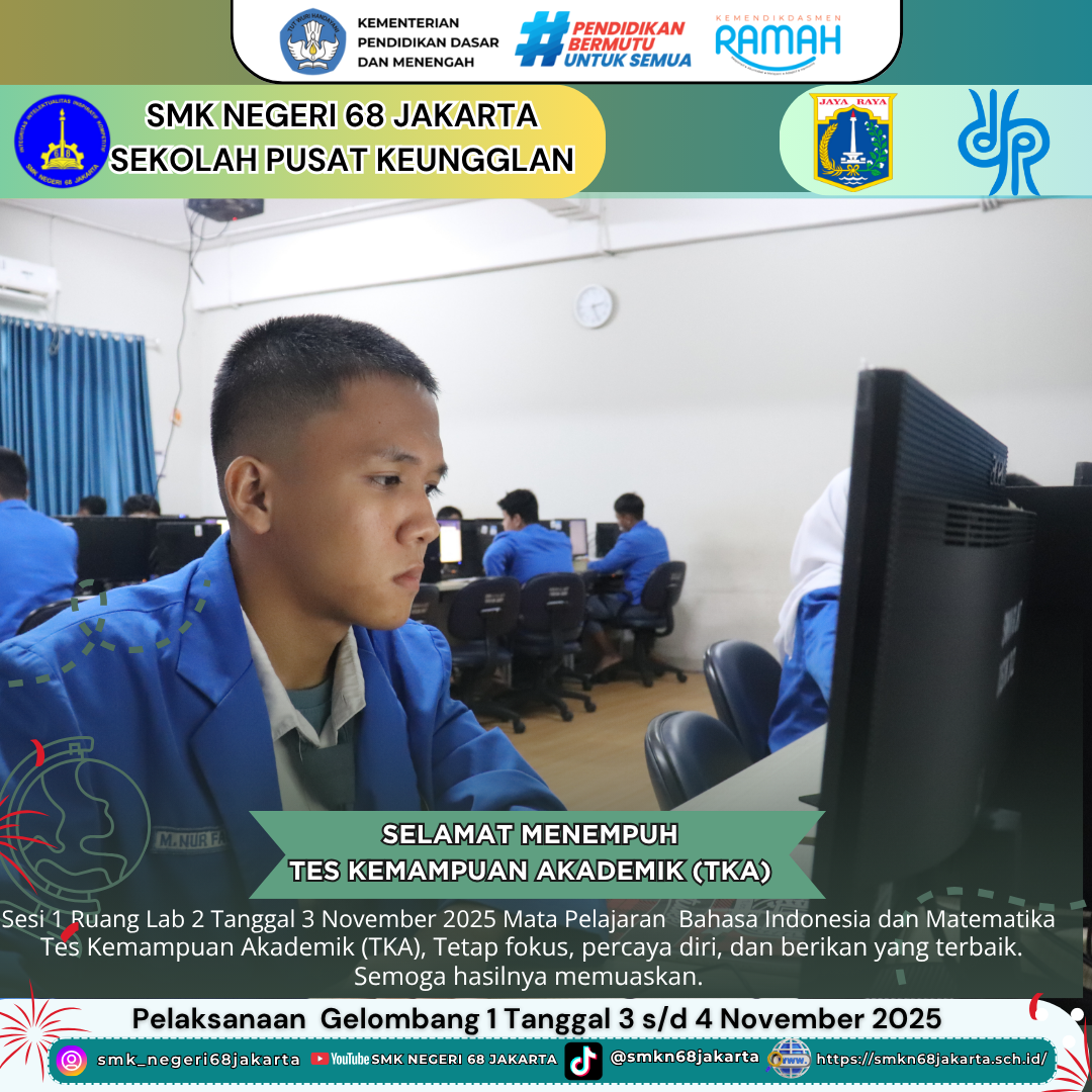 SMK Negeri 68 Jakarta, sebagai salah satu Sekolah Pusat Keunggulan, telah sukses menyelenggarakan rangkaian kegiatan Penilaian Kemampuan Akademik (TKA) selama dua hari berturut-turut pada tanggal 3 dan 4 November 2025.